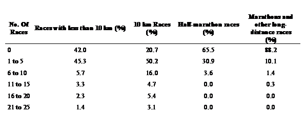 The predominant educational qualifications were the level of bachelor's degree (41.6%), secondary education (11th/12th year) (35.6%), master/doctorate (15.7%) and basic education (up to 9th year) completed (7.1 %). The most commonly raced distance by the majority of the respondents was 10 km, 73.4% (n = 540), with 26.6% (n = 196) completing the 5 km run. Race loyalty measured by the number of complete races in the last year showed that the majority of respondents (45.3%) had completed between one and five races under 10 km, 50.2% had completed between one and five races of 10 km, 30.9% had completed between one and five half-marathon runs and 10.1% between one and five marathons, see Table 2. The average number of total races run by respondents each year was 17.88.