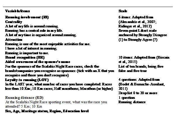 The individuals were selected from the runners of the Scalabis Night Race, which constituted a sample for convenience. The selection of this specific event was made according to the following criteria: (1) it can be considered as both a leisure and competitive event, but there is no prize money; (2) the event had several co-sponsors, which facilitated the study methodology and the measurement of sponsors' brand recognition; and (3) the event has a good participation rate, with more than 4,000 runners, which is needed to obtain a good sample.