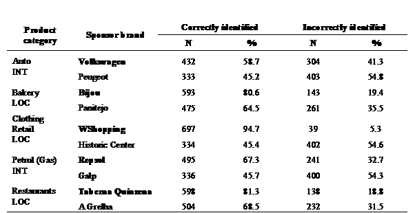 The product categories Petrol (Gas) and Auto, both international brands, were the false sponsors with the highest brand recognition rates, being just 13.0% and 3.9%, respectively, of the true sponsors, see Table 4. The two sponsoring brands with the highest levels of brand recognition were WShopping (94.7%) and Taberna Quinzena (81.3%), both local brands.