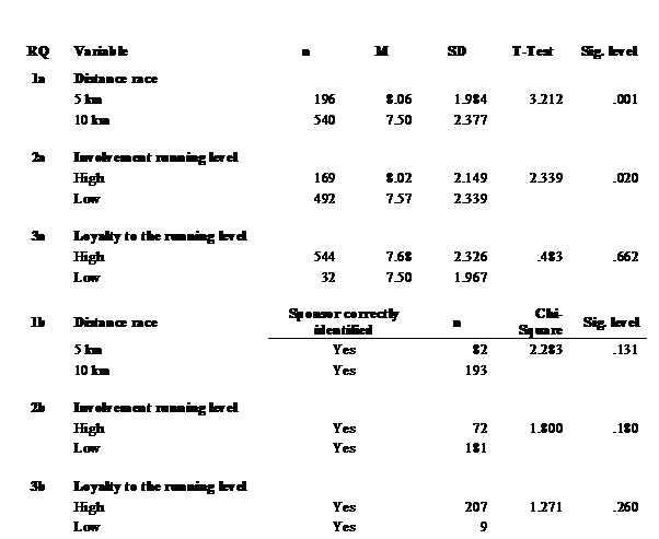 The aim of this research is (i) to determine the existence of differences in the recognition rates of sponsors (sponsor brand recognition rate) in the runners who ran for the distances of 5 and 10 km, in the runners with both high and low levels of running involvement, and in runners with high and low loyalty levels towards running; (ii) to determine whether, among the runners who correctly identified the sponsors, the proportion of runners who completed the 10 km run, with a high level of running involvement and a with high level of loyalty to running, was higher than the proportion of runners who completed the 5 km run, with low levels of running involvement and higher levels of loyalty towards running.