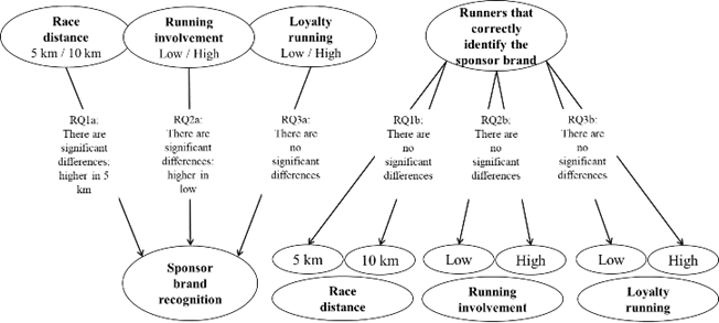 The aim of this research was to determine the existence of differences in the sponsors’ brand recognition rate in runners of distances of 5 and 10 km, in runners with both low and high levels of running involvement, and in runners with low and high levels of loyalty to running. Six distinct research questions were tested.