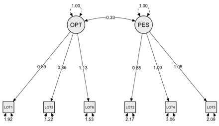 Regarding internal consistence, the composite reliability for Optimism was CR=0.72, and for Pessimism was CR=0.70. The standardized factor loadings of the LOT-R-Sport are presented in the table 1.