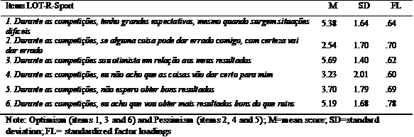 This study reported the procedures used to adapt and validate the LOT-R for the Brazilian sports context (LOT-R-Sport). The scale adaptation was used to provide items that significantly measure optimism in the sports context. Athletes and scholars in the field confirmed the relevance of the items. The reliability analysis also indicated that the items are adequate to assess optimism in the sports context. LOT-R-Sport has a clear structure with two related factors and has adequate psychometric properties.