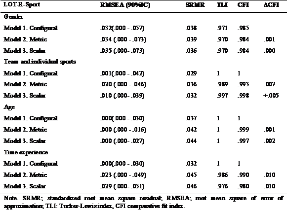 A Multigroup Confirmatory Factor Analysis (MGCFA) was used to determine if the LOT-R-Sport configuration and parameters are invariant for different sexes (boys and girls), sports (team and individual), ages (14, 15, 16 and 17 years) and years of experience (from 0 to 3 years, from 4 to 6 years, and more than 6 years). This analysis is important because the differences between groups may be related to the usage of non-equivalent parameters of the instrument (Hirschfeld & Brachel, 2014). The models evaluated were: Model 1 (configural invariance) analysed whether the structure of the scale was plausible for both groups; Model 2 (metric invariance) investigated if factor loadings of the items were equal across groups; Model 3 (scalar invariance) assessed whether the initial level of the latent variable was equal across groups (Brown, 2015). The models were ordered hierarchically. Each constrained model was nested within a less restricted one. The measurement invariance was assessed using the CFI difference test (ΔCFI, Cheung & Rensvold, 2002). If, when setting a parameter, a significant reduction is found in the CFI indexes (ΔCFI> 0.01), the measurement invariance cannot be accepted (Cheung & Rensvold, 2002).