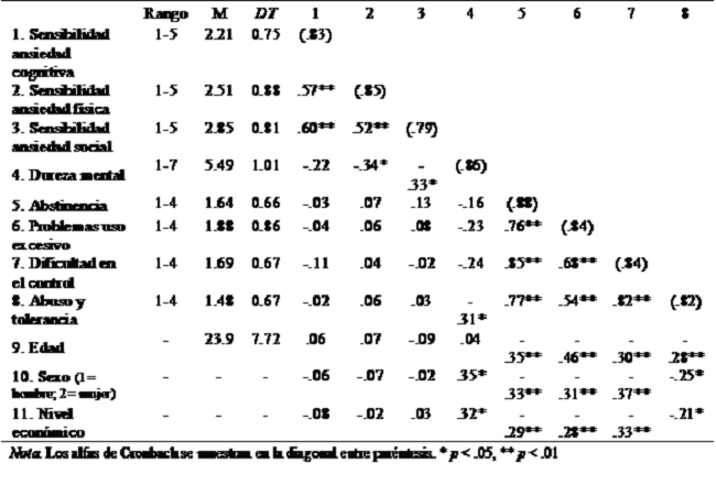 En la Tabla 1 se muestran las medias, desviaciones típicas, alfas de Cronbach y correlaciones entre todas las variables del estudio, así como con la edad, el sexo, el nivel educativo y económico de los participantes. Considerando la media escalar, los deportistas del estudio informaron de baja sensibilidad a la ansiedad, una alta dureza mental, y una baja adicción a los videojuegos. La consistencia interna de los instrumentos del estudio fue aceptable, oscilando los alfas de Cronbach entre .79 y .88 (véase Tabla 1).