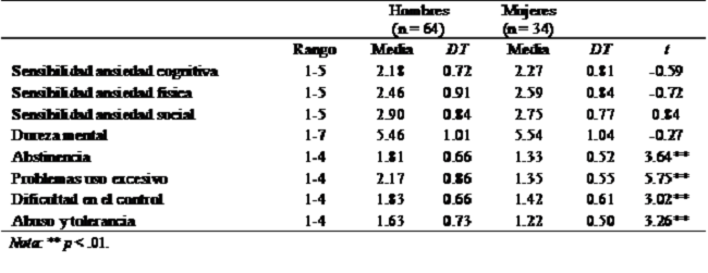 La prueba t realizada para comparar a los hombres y mujeres mostraron que no existieron diferencias por sexo en las variables de sensibilidad a la ansiedad ni en la dureza mental (véase Tabla 2). Sin embargo, confirmando lo obtenido en las correlaciones, sí se observaron diferencias por sexo en las variables de adicción y dependencia a los videojuegos, siendo los hombres los que informaron en mayor medida que las mujeres sentir malestar cuando no pueden utilizar los videojuegos (abstinencia), tener más problemas ocasionados por los videojuegos (problemas uso excesivo), mayor dificultad en el control y mayor abuso y tolerancia a los videojuegos.