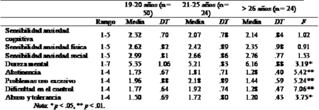 En la Tabla 3 se muestran los resultados del ANOVA realizado para examinar las posibles diferencias por grupos de edad, encontrándose diferencias significativas por edad en las variables de dureza mental y de adicción y dependencia a los videojuegos. Los resultados post hoc (Tukey HSD) mostraron que los mayores de 26 años respecto a los menores (19-20 años) y medianos (21-25 años) poseen mayor dureza mental (M = 6.16; M = 5.34; M = 5.21 respectivamente), así como menor abstinencia (M = 1.28; M = 1.73; M = 1.81 respectivamente), menores problemas por el uso excesivo de videojuegos (M = 1.43; M = 1.95; M = 2.18 respectivamente) y menor dificultad en el control (M = 1.28; M = 1.77; M = 1.92 respectivamente). Por último, los deportistas entre 21 y 25 años en comparación con los más mayores (más de 26 años) informaron de mayor abuso y tolerancia a los videojuegos (M= 1.72; M = 1.20 respectivamente
