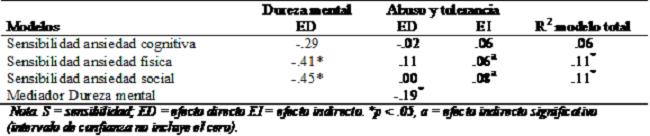 En la Tabla 4 se presentan los resultados de los análisis de regresión en los que se analiza si la dureza mental media la relación entre las variables de sensibilidad a la ansiedad y el abuso y la tolerancia a los videojuegos. La posible predicción en el resto de las variables de adicción y dependencia a los videojuegos (i.e., abstinencia, problemas uso excesivo y dificultad en el control) no se ha analizado, dado que, en las correlaciones previas, la asociación entre la dureza mental y dichas variables criterio no ha resultado estadísticamente significativa. La sensibilidad a la ansiedad física y social predice negativamente la dureza mental, la cual a su vez predice negativamente el abuso y la tolerancia a los videojuegos. Dichas sensibilidades (física y social) no predicen directamente el abuso y la tolerancia a los videojuegos, pero sí que la predicción es significativa a través de su relación con la dureza mental (véase Figura 2).