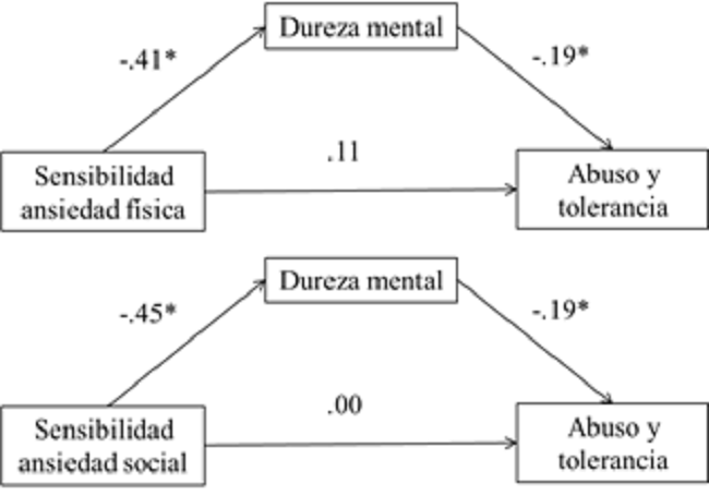 Tomando como referencia la literatura expuesta anteriormente y para dar respuesta al objetivo propuesto, se pone a prueba un modelo en el que se hipotetiza que la relación entre la sensibilidad a la ansiedad y las variables de adicción y tolerancia estará mediada por la dureza mental (véase Figura 1).