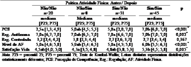Quando comparadas as distribuições das variáveis percepção de competência (p<0,001), regulação autônoma (p=0,002), nível de atividade física (p<0,001) e escala de satisfação com a vida (p=0,005) entre as categorias do histórico de prática de atividade física (Antes/Depois do diagnóstico) foram encontradas diferença significativas (Tabela 1). Os resultados mostraram que no grupo de mulheres que fazia atividade física antes do diagnóstico e continuou com a atividade durante o tratamento para o câncer de mama, a percepção de competência, a regulação autônoma, a satisfação com a vida e consequentemente o nível de atividade física foram maiores.