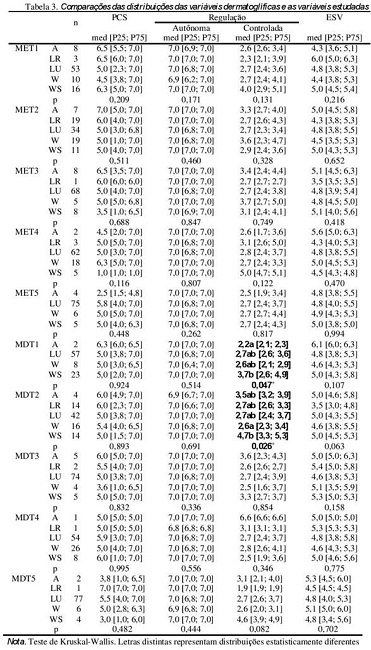 Para comparar as combinações das categorias das mulheres de acordo com as respostas do histórico de prática de atividade física, antes do diagnóstico da doença e durante o tratamento, utilizou-se o teste de Kruskal-Wallis, uma vez que um dos grupos apresentou tamanho (n) menor que 12 sujeitos. Estudou-se também os graus de relações entre as características dermatoglíficas e as variáveis competência percebida, grau de autonomia para a prática de atividade física nível de atividade física e satisfação com a vida. O nível de significância adotado foi de 0.05. As análises foram realizadas no SPSS v.25.
