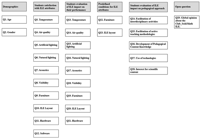 The first section asked students to provide demographics information, such as their gender and age. The second and third sections of the questionnaire focused on students’ satisfaction with the ILE’ attributes and their perceptions of the impact of these attributes on their performance, using the same Likert scale questions of Yang et al.’ (2013) questionnaire. Concerning attributes, students had to assess the environment (temperature, air quality, artificial lighting, daylight, acoustics related to hearing the teacher, visibility concerning the ability to see the visual aids), space (furniture and global layout) and technology (hardware and software) of the ILE. Students were also inquired about the previous attributes’ impact on their performance, according to Yang et al. (2013), excluding software, because in the classes that students attended, they did not use specific software for science learning. According to Yang et al. (2013), respondents were also asked to identify the predefined conditions for ILE attributes, with a focus on furniture and the ILE layout, in the fourth section, selecting their answers from a set of options presented.