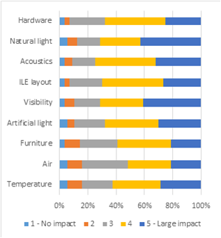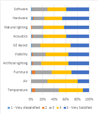 The impact of each one of the ILE attributes on students’ performance was evaluated with the highest ratings (4 and 5) by at least 60 percent of the participants, except for furniture and air. The two attributes that received the highest rating (5 - Very satisfied) by a greater proportion of participants were natural light and visibility. The CreativeLab_Sci&Math ILE is constituted by two large spaces with enough space for many students and a good visibility of the whiteboard and projection equipment. The students can also see their colleagues easily when they are talking or doing practical work. Air and furniture received the lowest values regarding impact on their performance.