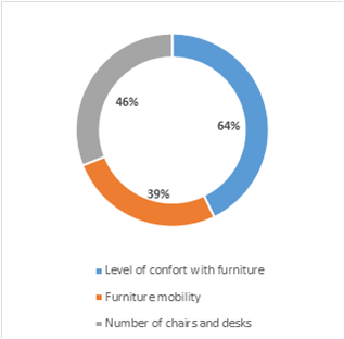 The CreativeLab_Sci&Math spaces also have large windows across the major walls, which provides enough natural light, a feature appreciated by students. Although the spaces have air conditioning, the temperature was the attributed that caused more dissatisfaction, as in the case of this student: “It’s a comfortable, albeit cold environment” (S22). One element that may explain this result is the fact that the spaces were very cold at the beginning of classes, and the survey was applied in the winter. About the furniture, the higher education students were also inquired concerning the predefined conditions for that attribute (Figure 4).