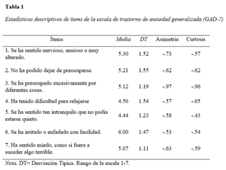 A continuación, se muestran en la Tabla 1 los estadísticos descriptivos de los ítems correspondientes a la escala de trastorno de ansiedad, en el cual se muestran los ítems, la media, la desviación típica, la asimetría y la curtosis.