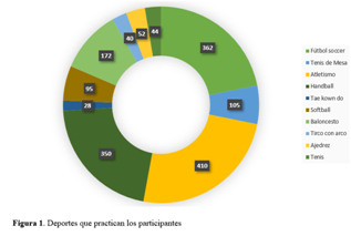En la figura 1, se muestra la distribución de la muestra del estudio, según el deporte que practican. La disciplina deportiva que más deportistas tuvo en la encuesta fue el atletismo con 410 sujetos (25%), la segunda disciplina deportiva fue el Handball, con 350 deportistas (21%), seguido por el fútbol soccer, con 362 deportistas (22%), el cuarto deporte con más participantes fue el baloncesto con 172 (10%), seguido por el tenis de mesa 105 deportistas (6%), softball 95 deportistas (6%), ajedrez con 52 deportistas (3% ), tiro con arco con 40 deportistas (2%), y tae kown do 28 deportistas (2%).