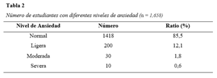 La Tabla 2 muestra cómo la salud mental de los jóvenes universitarios se vio afectada en diversos grados durante el brote. De los 1,658 jóvenes universitarios, el 85.5% no tenían síntomas de ansiedad, mientras que las proporciones de estudiantes con ansiedad ligera, moderada y severa fueron 12.1%, 1.8% y 0.6%, respectivamente.