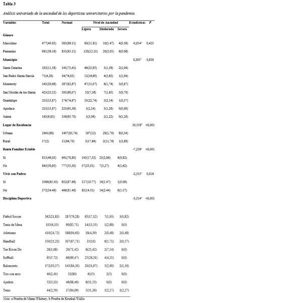 RESUMO : Um novo vírus denominado COVID-19, começou a se espalhar em Wuhan (China) desde o final de 2019, e agora é encontrado em todo o mundo. Esse vírus, além de aumentar o risco de morte por infecção, também aumenta a pressão psicológica sobre a humanidade. Amostras de atletas das diferentes faculdades da UANL foram obtidas por meio de amostragem por conglomerado, que respondeu a uma bateria de questionários que incluiu a Escala de Transtorno de Ansiedade Generalizada composta por 7 itens (GAD-7). 1,658 respostas foram recebidas. Os resultados indicaram que 0,6% dos entrevistados experimentaram ansiedade severa, 1.8% ansiedade moderada e 12.1% ansiedade leve. Da mesma forma, os fatores Morar em Áreas Urbanas (OR = 0.818, IC 95% = 0.702 - 0.914), Estabilidade da Renda Familiar (OR = 0.723, IC 95% = 0.633 - 0.807) e Morar com os Pais (OR = 0.752, IC 95 % = 0.585 - 0.952) eram protetores contra a ansiedade. Praticar um esporte coletivo era um fator de risco para ansiedade. De acordo com o estudo, sugere-se que a saúde mental dos alunos seja acompanhada durante o contingente causado pela epidemia de COVID-19.