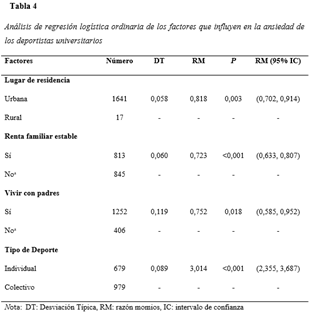 La Tabla 3 muestra la relación entre las variables demográficas de los deportistas y la ansiedad. Vivir con los padres tuvo un efecto significativo sobre la ansiedad, de modo que los deportistas que vivían solos tuvieron una mayor ansiedad (P < 0.05), mientras que el género y la región no tuvieron un efecto significativo sobre la ansiedad (P > 0.05). Además, los deportistas de áreas rurales (2%), familias sin un ingreso estable (50.95%) y que no viven con sus padres (24.44%), eran más propensos a estar severamente ansiosos (P < 0.001).