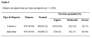 En la tabla 5 se puede demostrar que la mayoría de los deportistas de deportes colectivos resultaron tener mayor ansiedad que los deportistas de deportes individuales.
