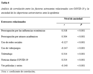 Los resultados del análisis de correlación se muestran en la Tabla 6, donde podemos ver que la preocupación por las influencias económicas de la epidemia se relacionó positivamente con los niveles de ansiedad en los deportistas universitarios (r = 0.318, P < 0.001). Además, la preocupación por los atrasos académicos (r = 0.304, P < 0.001), la preocupación por retrasos académicos (r = 0.316, P < 0.001), el teletrabajo (r = 0.326, P < 0.001) y ver noticias diarias de COVID-19 (r = 0.314, P < 0.001) también se correlacionaron moderada y positivamente con el nivel de ansiedad. Por otro lado, los resultados señalaron una asociación negativa entre el uso de redes sociales (r = 0,-0.127, P < 0.001) y el uso de videojuegos (r = -0.147, P < 0.001) con los síntomas de ansiedad de los jóvenes deportistas durante el brote de COVID-19.
