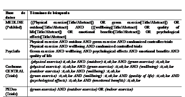 La estrategia de búsqueda seguida fue el análisis de estudios clave que comprendiesen los conceptos de ejercicio en interior y exterior relacionados con el bienestar centrándose en los diseños experimentales (ensayos controlados aleatorizados). Se utilizaron las siguientes palabras clave: “physical exercise”, “green exercise”, “outdoor”, “wellbeing”, “quality of life”, “emotional benefits”, “psychological effects” y “randomized controlled trial”. La estrategia de búsqueda se realizó en 4 bases de datos: PubMed, PsycInfo, Cochrane Library y PEDro. Se utilizaron los filtros de búsqueda avanzada, limitando las palabras al campo de título y resumen y acotando la fecha de publicación de 2011 a 2020. Las estrategias de búsqueda específicas por cada una de las bases de datos están reflejadas en la Tabla 1. Además de la búsqueda en bases de datos, se realizaron búsquedas manuales en las referencias bibliografías de los estudios incluidos y de otros artículos de revisión relevantes identificados en estos artículos adicionales, con el objeto de localizar aquellos estudios empíricos que cumpliesen con los criterios de inclusión.