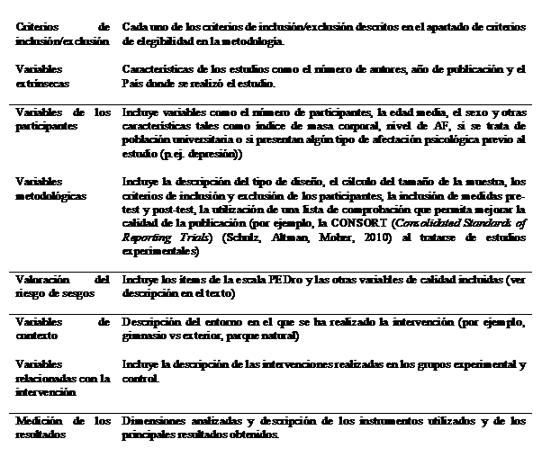 Para la codificación de los estudios incluidos y previo al inicio del trabajo de campo, se elaboró un Protocolo de Registro y un Manual de Codificación en el que se definen cada una de las características que van a ser extraídas de cada uno de los estudios incluidos (Sánchez-Meca y Botella, 2010). En la Tabla 2 se describen las diferentes variables agrupadas por categorías. El proceso de búsqueda de los estudios y la extracción de datos fueron llevados a cabo por dos evaluadores de forma independiente y a ciegas.