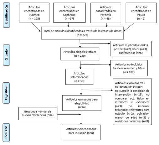 A través de la búsqueda electrónica se identificaron un total de 272 documentos (véase Figura 1), de los cuales se excluyeron 52 documentos dando como resultado 220 artículos potencialmente relevantes. Se excluyeron 182 artículos tras la lectura del título y del resumen al no estar claramente relacionados con los objetivos del estudio. De los 38 los artículos restantes, se excluyeron, una vez leído el texto completo, 34 documentos por diversos motivos: no cumplir la condición de intervención (n=16), por no comparar AF en exteriores e interiores (n=3), por no informar resultados relevantes para el estudio (n=2) y por tratarse de población menor de edad (n=5) o ser revisiones narrativas (n=8). El resultado fue la selección de un total de cuatro artículos. Tras la búsqueda manual en las referencias de los mismos se identificaron 4 nuevos artículos que cumplían los criterios de selección. En resumen, se seleccionaron un total de ocho artículos con nueve unidades de análisis (UA) para su inclusión en la revisión sistemática (Kinnafick y Thøgersen-Ntoumani, 2014; Calogiuri, Nordtug y Weydahl, 2015; Calogiuri et al. 2016; Turner et al, 2017; Byrka et al, 2018; Legrand et al, 2018; Olafsdottir et al, 2018; y Alkahtani, 2019). En total, la revisión incluye a una muestra de 320 adultos participantes Uno de los artículos (Kinnafick y Thøgersen-Ntoumani, 2014) presenta los resultados de dos estudios diferentes (dos unidades de análisis -UA-). Dos de los documentos encontrados presentan los resultados de escalas complementarias del estudio realizado en la misma muestra de participantes (Calogiuri, Nordtug y Weydhal, 2015 y Calogiuri et al. 2016).