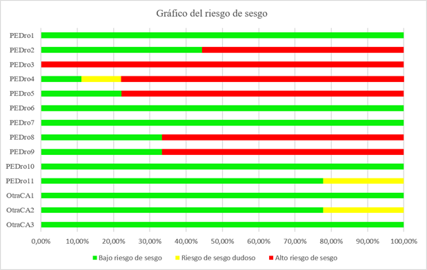 La evaluación del riesgo de sesgo para cada estudio con los criterios de la escala PEDro y los otros criterios de calidad utilizados aparece en la Tabla 4. En la figura 2 se presenta la gráfica del riesgo de sesgo según dada uno de los indicadores utilizado para valorar la calidad de los estudios. En dos ítems de la escala el riesgo de sesgo fue del 100%. Estos ítems fueron el cegamiento de los responsables de la intervención y de los evaluadores. La similitud (criterio cuatro) entre grupo control y experimental podría haber sido dudosa para el estudio de Byrka y Ryczko (2018), debido a que las condiciones de los participantes no fueron las mismas al incluir a participantes de baile profesionales y no profesionales, esto podría haber influido en los resultados, provocando un posible riesgo de sesgo. En uno de los artículos (Turner y Stevinson, 2017) los datos se presentan en forma de figuras, no de datos numéricos, por lo que no se pudo obtener la media ni la desviación estándar de los resultados.