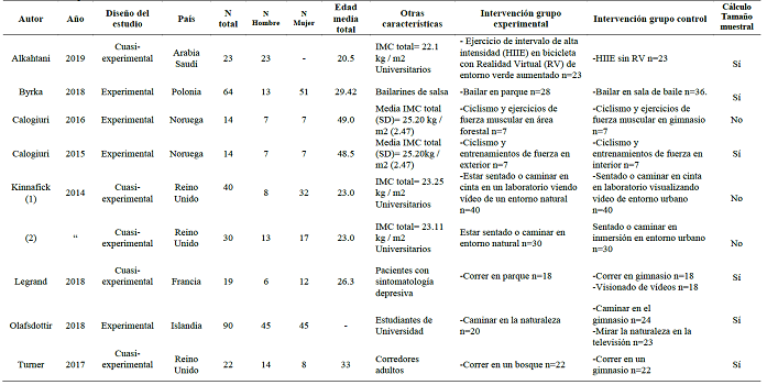 Todos los estudios incluidos se realizaron para evaluar la influencia del contexto (exterior o interior) en los efectos de la AF. Las intervenciones consistieron en diversas actividades físicas realizadas por los participantes: caminar (n=3), correr (n=2), montar en bicicleta o cicloergómetro (n=3), entrenamiento de fuerza muscular (n=3) y bailar (n=1).