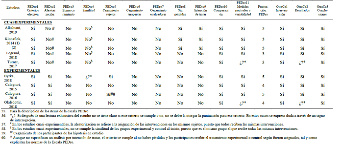 A los ítems integrados en la escala PEDro se añadieron otros tres ítems obtenidos de entre los utilizados en el artículo de Thomsom Coon et al. (2011). Estos ítems son: i) existencia de una descripción clara de la intervención y similitud entre ambos grupos; ii) validez de las medidas de resultado y similitud en la medición; y iii) la existencia de coherencia entre conclusiones y resultados obtenidos.