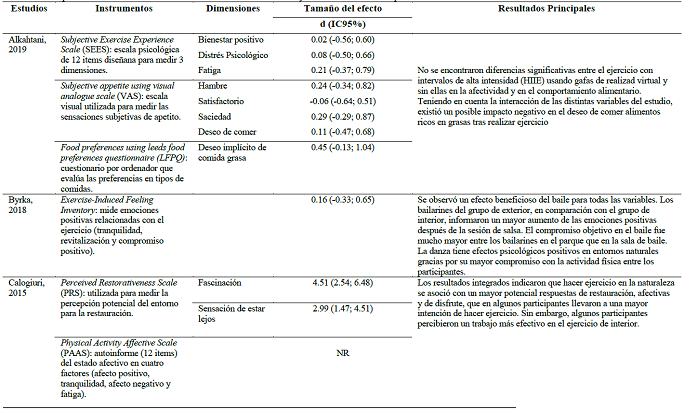 En esta revisión se identificaron ocho estudios relevantes, que midieron una amplia gama de diferentes instrumentos de medida relacionadas con el bienestar emocional utilizando un elevado número de escalas diferentes: estado de ánimo, emociones positivas y negativas, restauración percibida, respuestas afectivas positivas y negativas hacia el ejercicio, disfrute, sensación de placer, vitalidad, energía y fatiga percibida, indicadores fisiológicos de estrés, nivel de activación, atención, sensaciones de apetito, preferencias alimentarias, aptitud y conexión con la naturaleza, compromiso con la AF e intención de ejercicio futuro. En la Tabla 5 se describen las diferentes escalas y dimensiones, así como los tamaños de los efectos y los principales resultados encontrados.