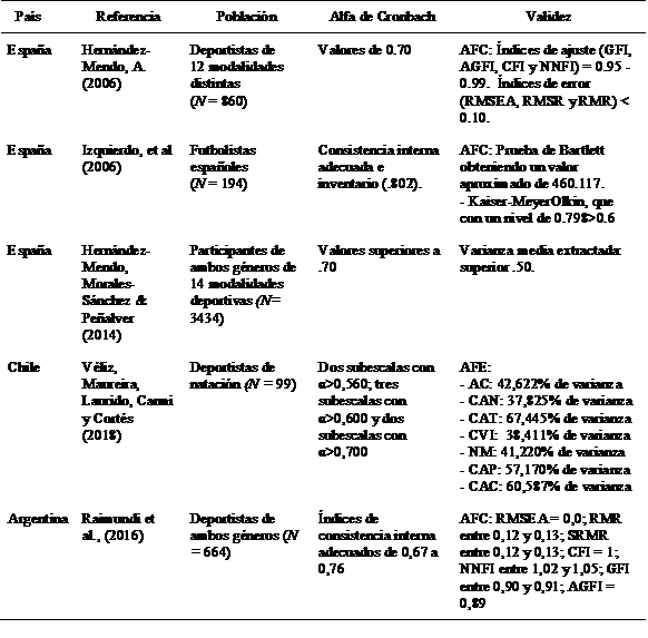 En Sudamérica, el estudio de Véliz, Maureira, Laurido, Carmi y Cortés (2018), revisaron las propiedades psicométricas en una muestra de nadadores en Chile, donde se presentaron los resultados a partir de la consistencia interna de cada subescala.