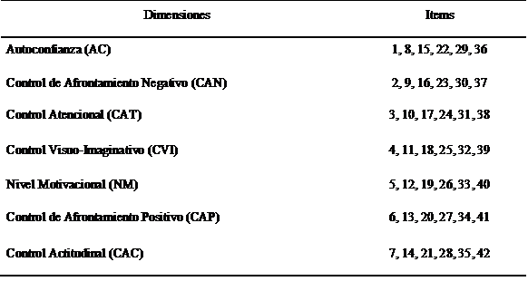 El instrumento utilizado fue el inventario psicológico de ejecución deportiva (IPED) previamente adaptado al español en un estudio para deportistas argentinos por Raimundi et al., (2016). Evalúa los factores psicológicos que se asocian en el rendimiento deportivo y se conforma por 42 ítems organizados en 7 subescalas: Autoconfianza (AC), Control de Afrontamiento Negativo (CAN), Control Atencional (CAT), Control Visuo-Imaginativo (CVI), Nivel Motivacional (NM), Control de Afrontamiento positivo (CAP) y Control Actitudinal (CAC). El inventario presenta cinco opciones de respuesta tipo Likert que van desde casi siempre hasta casi nunca. Los ítems se agrupan en siete subescalas y se muestran en la tabla 2.