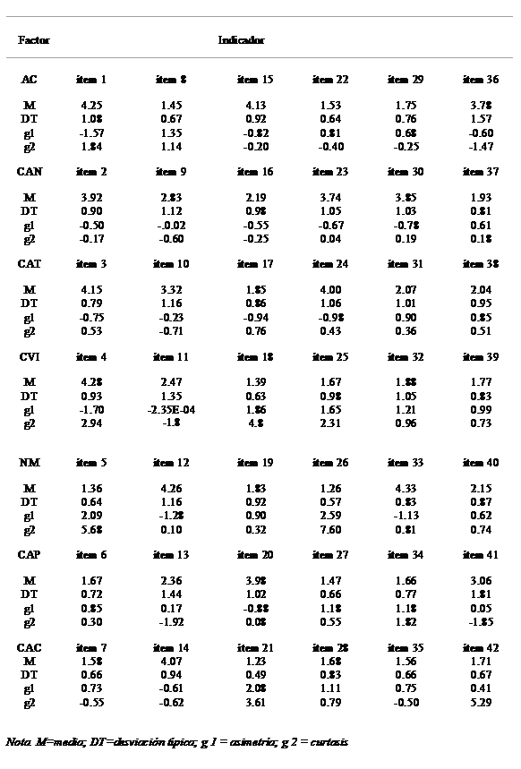 Respecto a la dimensión CAP, el promedio más alto lo obtuvo el ítem 20 (M= 3.98), mientras que el ítem 27 fue el menor (M= 1.47). Respecto a la asimetría y curtosis, los valores se ubicarían dentro del rango límite. Finalmente, el ítem 14 del factor CAC, fue el que obtuvo la mayor media de dicha dimensión (M= 4.07); mientras que el ítem 21 puntuó la menor (M= 1.23). En relación a la asimetría y la curtosis, el ítem 21 y el 42 sobrepasan los valores establecidos de 2+. En este sentido, los demás ítems de dicha dimensión (7, 14, 28 y 35), se encuentran dentro del rango límite dispuesto.