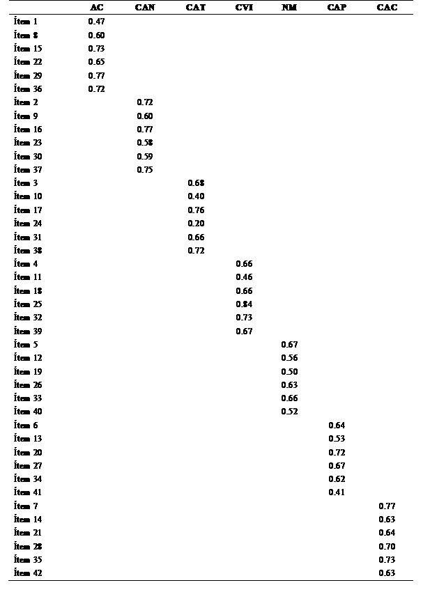 Las cargas factoriales de las dimensiones fueron significativas y adecuadas para el modelo presentado. En la primera y segunda dimensión (AC y CAN), se muestran valores de λ= .47 y λ= .58. Sin embargo, la tercera dimensión (CAT), obtuvo un puntaje mínimo de λ= .20 en el ítem 24. A pesar de no conformar una carga factorial idónea, se decidió mantenerlo y no eliminarlo. Las siguientes dimensiones (CVI, NM, CAP y CAC) iniciaron su puntuación en λ= .41 y, se observa como puntaje máximo el valor λ= .84. De este modo, se presentan cargas factoriales adecuadas para la confirmación de la estructura de la prueba. En la tabla 5, se observa el análisis de los índices de las 7 dimensiones mencionadas.