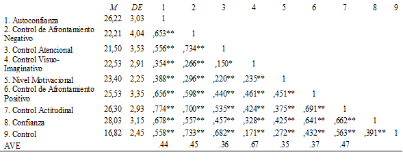 En relación al análisis de correlación para la validez convergente, el tamaño del efecto de la muestra se estimaría con valores igual o superiores a .31 a .50, lo que evidencia una correlación moderada (Cohen, 1988). La validez interna convergente se estimó a partir del cálculo de la varianza promedio extraída (AVE), donde un valor mayor que .50 es adecuado (Fornell & Larcker, 1981).
