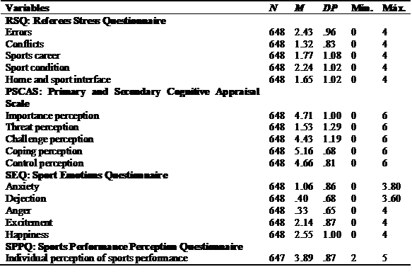 Primary and Secondary Cognitive Appraisal Scale (PSCAS; Gomes et al., 2017). Evaluates primary and secondary cognitive appraisal of individuals regarding their professional activity (in the case of this study, related to the referees’ activity). Primary cognitive appraisal is divided into three subscales: (a) importance perception (α = .91, in this study): evaluation of referees’ activity as personally significant and important for their wellbeing; (b) threat perception: (α = .85, in this study): evaluation of referees’ activity as disturbing and negative for their wellbeing; (c) challenge perception (α = .89, in this study): evaluation of referees’ activity as stimulating and exciting for their wellbeing. Secondary cognitive appraisal is divided into two subscales: (d) coping perception (α =.88, in this study): evaluation of personal resources to deal with the situation’s requirements and demands; and (e) control perception (α = .67, in this study): evaluation of personal control over the referees’ activity. This scale included 15 items, three per scale. The items are answered on a seven-point Likert-type scale (0 = Is not at all important to me; 6 = Is very important to me, for work importance). The score is obtained by averaging the items in each scale, meaning that higher scores correspond to higher levels of cognitive appraisal. The psychometric properties of this instrument were acceptable in this study: x 2 (80 g.l.) = 253.661, p < .000; x 2 /df = 3.171; RMSEA = .058, C.I. [.050; .066]; SRMR = .04; CFI = .968; TLI = .958 (Bentler, 2007).