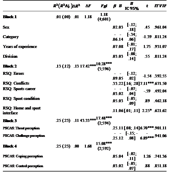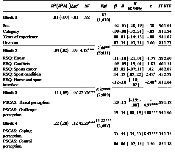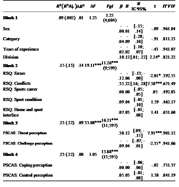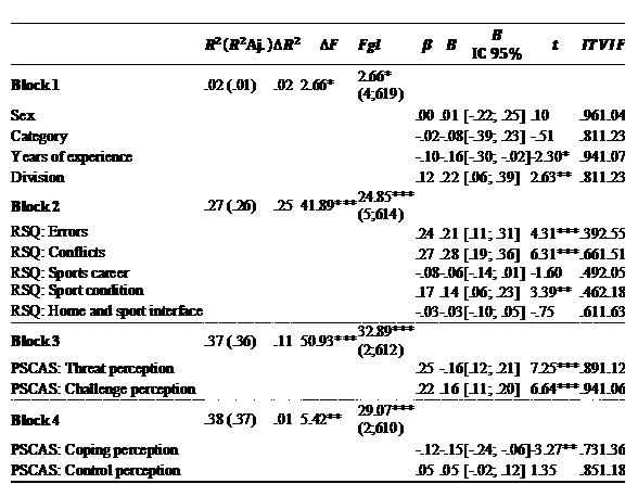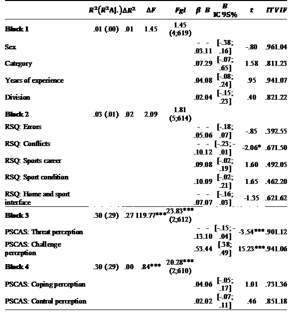 Regression analysis was performed by blocks. In block 1, we introduced one personal variable (sex) and three sports variables: category (that increases in terms of competitive level), years of experience, and competitive division (that increases in terms of geographic visibility, from district to international scenarios). In block 2, stress factors were introduced. In block 3, we introduced primary cognitive appraisal. In block 4, we introduced secondary cognitive appraisal.