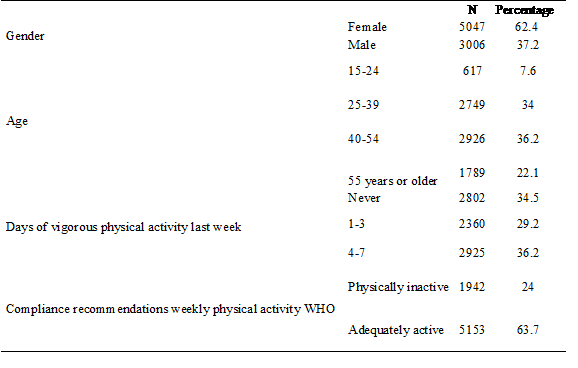 We start first presenting the overall results of the survey. Table 1 (below) helps us understand the characteristics of the sample. It presents the distribution of participants according the sociodemographic variables: age, gender, days of vigorous PA in previous week, and adherence to WHO PA guidelines.