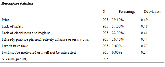The main objective of the study was to identify barriers to return to fitness centres after lockdown. The Table 2 presents perceived barriers to do PA after lockdown. These are: price (39.1%), lack of safety and protection against COVID-19 (37%), already doing PA at home/on their own (26.4%), and possible lack of hygiene in fitness centres (22%). Whereas there is a small difference, it is of interest that the economic barrier (price) is ahead of the health and safety barrier directly linked to COVID-19.