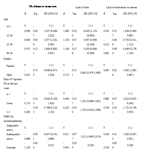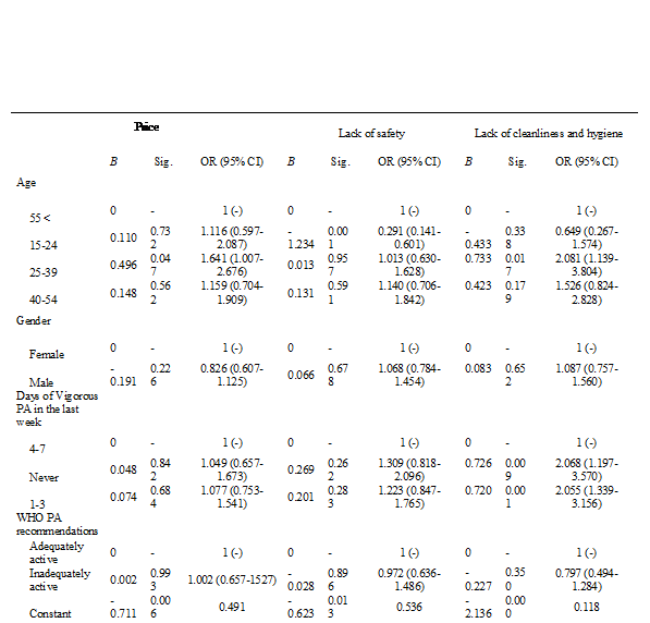 “Lack of safety” is less prevalent as a barrier in the youngest participants (15-24 years) [OR 0.29 (95% CI (0.14 - 0.60))], but it increases as we move along the age range. Interestingly, this is not replicated for “lack of cleanliness and hygiene”. In this case we find the young adults (25-39 years) are the group that has the barrier more present. In relation to levels of physical activity, this barrier is more prevalent amongst those less active, especially those who did not any PA in the previous week [OR 2.07 (95% CI (1.197 - 3.570))].