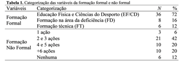 Os treinadores foram categorizados, consoante as variáveis independentes formação formal e não formal (Tabela 1). Neste contexto, Gilbert, Côté e Mallett (2006) sugerem investigar empiricamente o percurso de formação formal e as suas áreas de especialidade, referindo ser um contributo importante no processo global do desenvolvimento do treinador. A variável formação formal foi categorizada em função do título académico. A variável formação não formal foi categorizada pelo número de ações frequentadas nos últimos três anos, sendo este o período temporal estabelecido no diário da república portuguesa através da portaria 141/2020, para a renovação da cédula do título de treinador. Esta categorização sustenta a necessidade de aprofundar e especificar este tipo de formação (Nelson et al, 2006), dado que na área desporto adaptado estes momentos de aprendizagem são ínfimos (Fairhurst et al., 2016). As variáveis dependentes do estudo foram definidas através do instrumento de recolha de dados utilizado no estudo (tabela 2), que foram elaboradas de acordo com o quadro teórico desenvolvido por Ibáñez (1996,1997a, 1997b) e refinado por Feu e colegas (2007,2010).