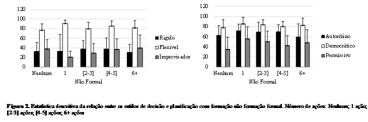 A figura 2 descreve os valores médios entre as variáveis do estilo de decisão e planificação com a formação não formal. Existe uma maior proeminência de formação não formal nos estilos de decisão flexível em comparação com os estilos improvisador e rígido. Na planificação, no estilo democrático observam- se valores médios mais altos de formação não formal em comparação com o estilo autoritário e permissivo. De salientar que tanto nos estilos de decisão e planificação não se encontram diferenças estaticamente significativas entre as dimensões.