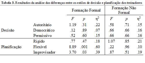 Os resultados demonstram que os treinadores apresentam estilos de decisão tendencialmente mais democrático, seguido dos estilos autoritário e permisso. Na planificação, os treinadores demonstram um estilo mais flexível, rígido e improvisador consecutivamente. Além disso, foram estudadas as relações entre os estilos de tomada de decisão dos treinadores e de planeamento. Relativamente ao tamanho do efeito, este foi na sua maioria de pequeno efeito em quase todas as dimensões dos questionários e consoante a analise efetuada à formação formal e não formal dos treinadores (Hattie, 2009). No entanto, na formação formal o estilo de planificação flexível apresenta um efeito intermédio, relançando a importância do binómio entre uma formação especifica e uma planificação de acordo as habilidades dos atletas.