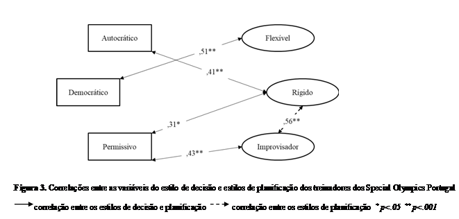 A tabela 3 mostra a análise da variância (ANOVA) e o η2 relativamente à análise efetuada através da comparação entre os estilos de decisão e planificação dos treinadores, com a sua formação formal e não formal. A figura 3 representa as relações entre a formação e o perfil dos treinadores. Foi efetuada uma análise bivariada com o intuito de determinar a relação entre as variáveis. Posteriormente usamos o coeficiente de Pearson para analisar a intensidade entre as variáveis dos estilos de decisão e planificação do treinador e determinar a significância das corelações entre elas.