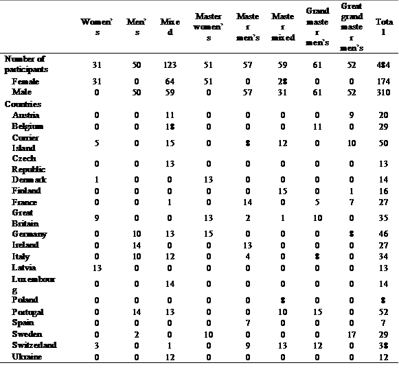In UF gender ratio is a rule that is defined the number of (F/M) elements entering the field to play the point. The attacking team chooses the number of elements (female / male) to be on the field for that point. With the gender ratio (3:2 or 2:3) at the start of the game, after the first disc flip (disc possession draw), an additional disc flip happens with the winner selecting the gender ratio for the first point. For the second and third points the ratio must be the reverse of the first point. For the fourth and fifth points the ratio must be same as the first point. This pattern of alternating the ratio every two points repeats until the end of the game (WFDF et al., 2009). Grand Master Men’s had 10 registered teams, and both Women’s and Great Grand Master Men’s had eight. The smallest division was Master Women’s, with six registered teams. Participants were grouped according to eight competitive divisions (Table 1): mixed (n=123), grand master men’s (n=61), master mixed (n=59), master men’s (n=57), great grand master men’s (n=52), master women’s (n=51), men’s (n=50) and women’s (n=31).
