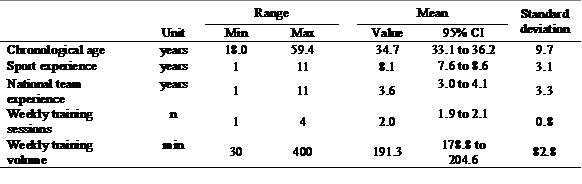 The participants, representing 19 countries, had an average age of 34.7±9.7 years. Sport experience was expressed as years of participation in competitive UF at the club level, including registration with the respective national associations. Individual training information was obtained by interview on the day of observation and the years of formal national team representations confirmed in consultation with institutional records of the WFDF (Table 2). All athletes participated in regular training sessions (1-4 sessions·week-1; 30-100 min·session-1) with their clubs. The average duration of the national ultimate competitions varies according to the competitive schedules of each national association.
