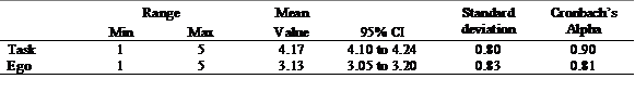 Descriptive statistics for the total sample on the subscales of POSQ are presented in Table 3. On average, UF athletes reported higher levels of perceived task orientations. The POSQ demonstrated reasonable internal consistency (values of α = 0.90 and α =0.81 for Task and Ego orientation, respectively) for the examined sample.