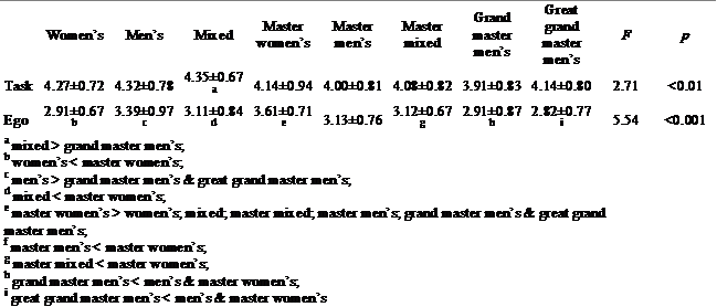 Comparisons between UF divisions on the POSQ subscales are presented in Table 4. Scores demonstrated that there was a significant main effect for UF division. When we analyse the data referring to the eight divisions, the mixed division presents the higher task score, while the Master women´s division presents the highest ego value. For the task subscale, the three divisions (women's, Men's and Mixed) have the highest values, and mixed athletes scored significantly higher than grand master men’s. As for the ego subscale: Men’s scored significantly higher than grand master men’s and great grand master men’s; and master women’s score significantly higher than women’s, mixed, master mixed, master men’s, grand master men’s and great grand master men’s.